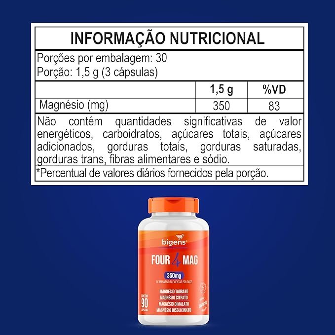 Four Mag, 4 Magnésio (taurato, citrato, dimalato, bisglicinato), 350mg de Magnésio Elementar, 90 Cápsulas, Bigens